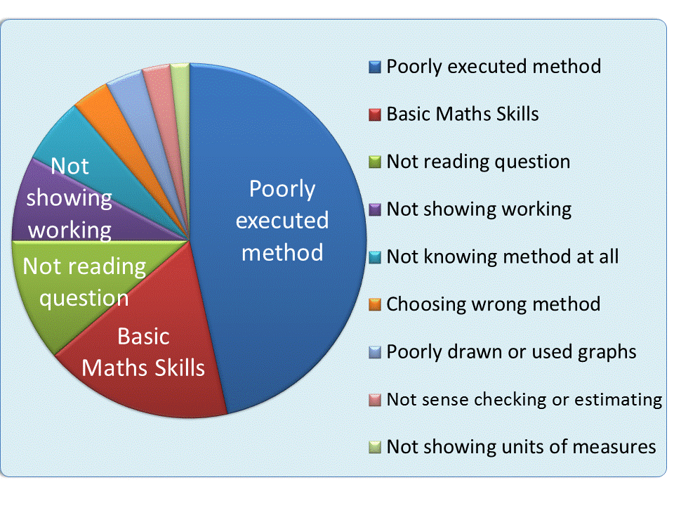 Initially I have looked in detail at 4 past papers, 100 questions, and captured the comments from each, 130 in all, for which the examiners highlighted common causes of lost marks from tens of thousands of entries. Then I grouped them and tallied them GCSE style in a frequency table and chart as seen left. This sheds light on general areas for revision, with (lack of) “basic maths skills” ferquently bemoaned by examiners, as well as subtle tips such as “read the question very carefully and make sure you show working”.