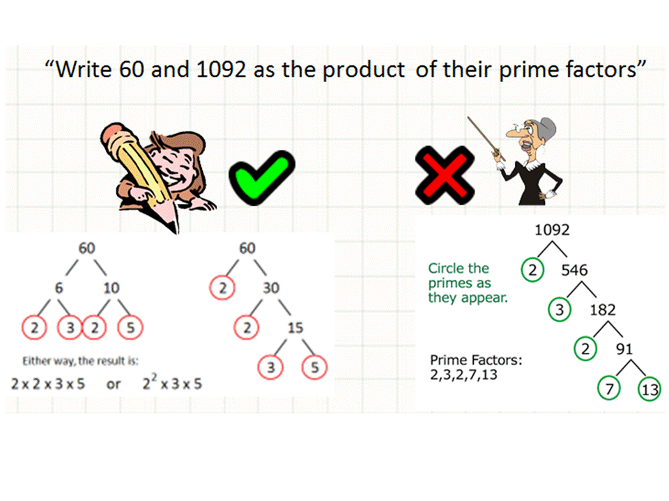 Then, further I picked out twenty very specific examples of errors that seemed to occur – this time syallabus technical content rather than functional categories above – and wrote and illustrated a list of “20 things examiners do and don’t like to see”. A typical one is shown. I recently took some examiner marking training and I can assure you this is true. If a question asks you to “express a number as a product of its prime factors” then merely listing them, with commas, will lose you a mark, if the “times” sign is missed out. Even if the numbers are riight as above.