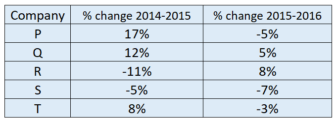 Here is a table listing the percentage changes in profit from 2014 to 2016 for five different companies. Using the table, if company Q earned £412,500 in 2014, how much profit did they make in 2016?