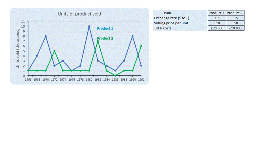 A business sells two products and the units sold in thousands are shown above by year. Some financial details for 1980 are shown below. Profit is calculated as sales value (sales price per unit x number of units sold), less total costs. How much more profit was made in $ in 1980 for product 1 than product 2?